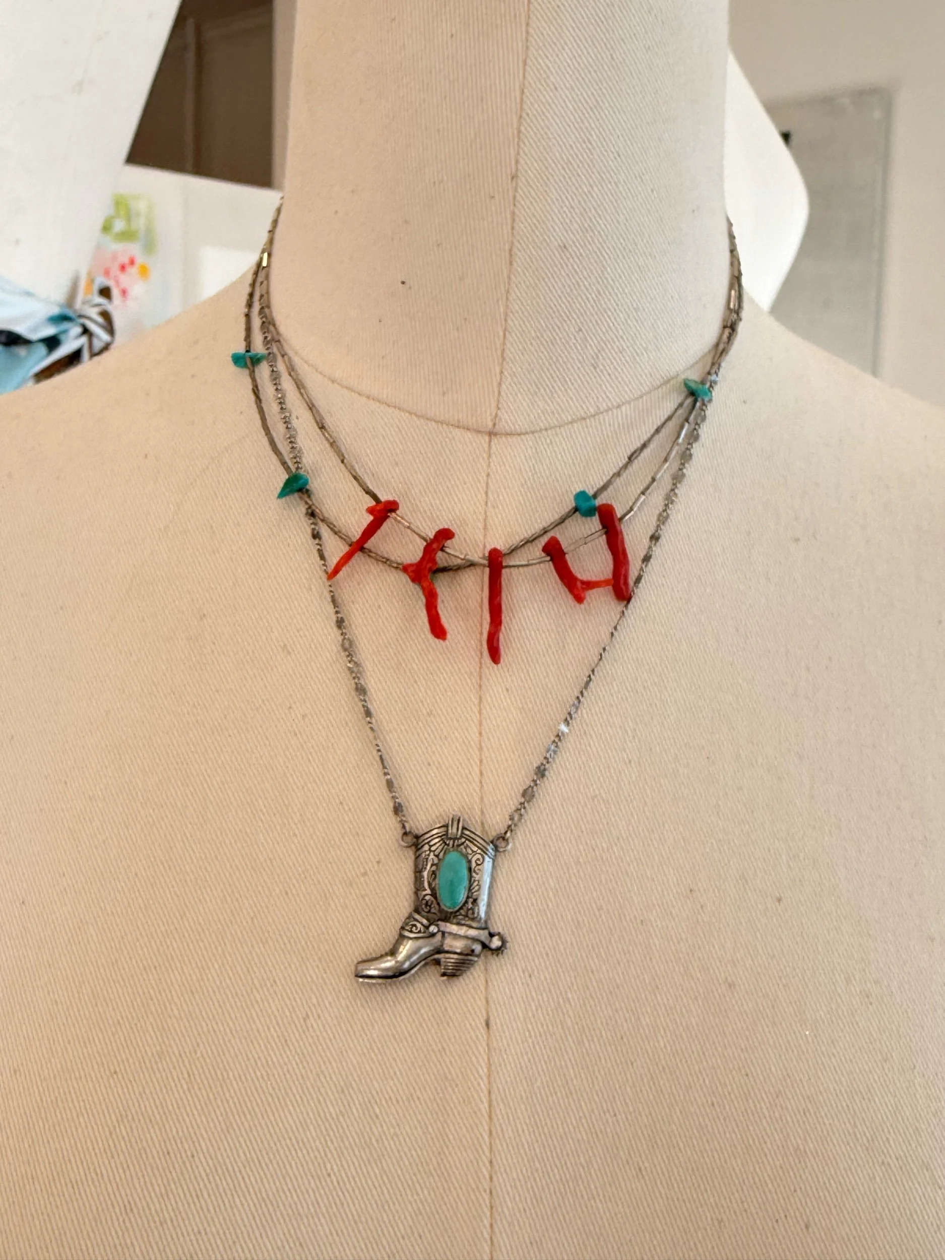 Vintage Tie Clip Turned Necklace! A fun Sterling boot with Genuine Turquoise Stone. 18” Sterling Starburst Chain, Spring Ring Clasp